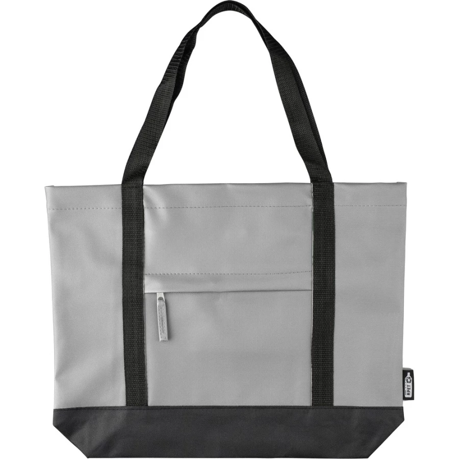 Einkaufstasche mit beidseitiger wasserabweisender Beschichtung, Volumen: 10 l, Traglast: 10 kg, lange Griffe, zwei verschließbare Außentaschen, Innentasche, RPET‑Symbol am Etikett, Material: RPET.
