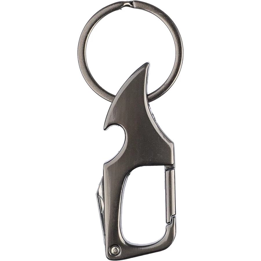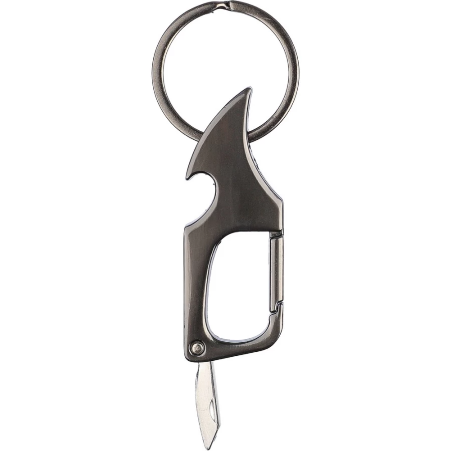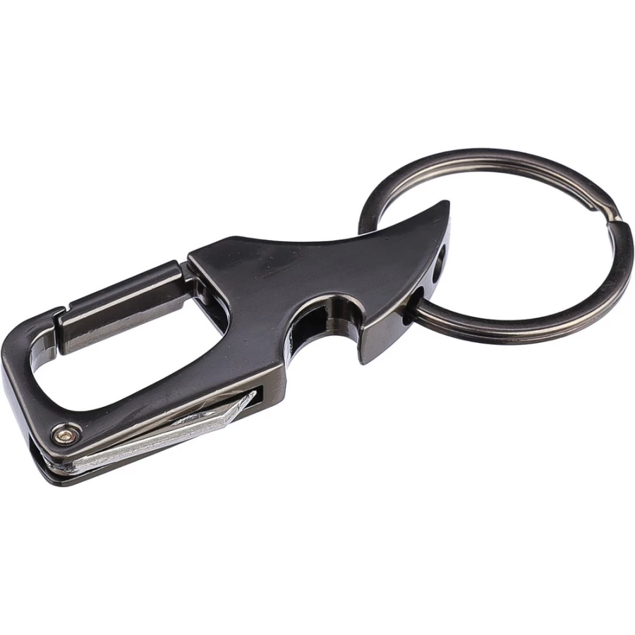 Schlüsselanhänger, Flaschenöffner mit Karabinerhaken zum Befestigen, ausgestattet mit einem kleinen Messer, das zum Öffnen von Kartons nützlich ist, verpackt in einem braunen Kartonumschlag, Produkt aus Metall