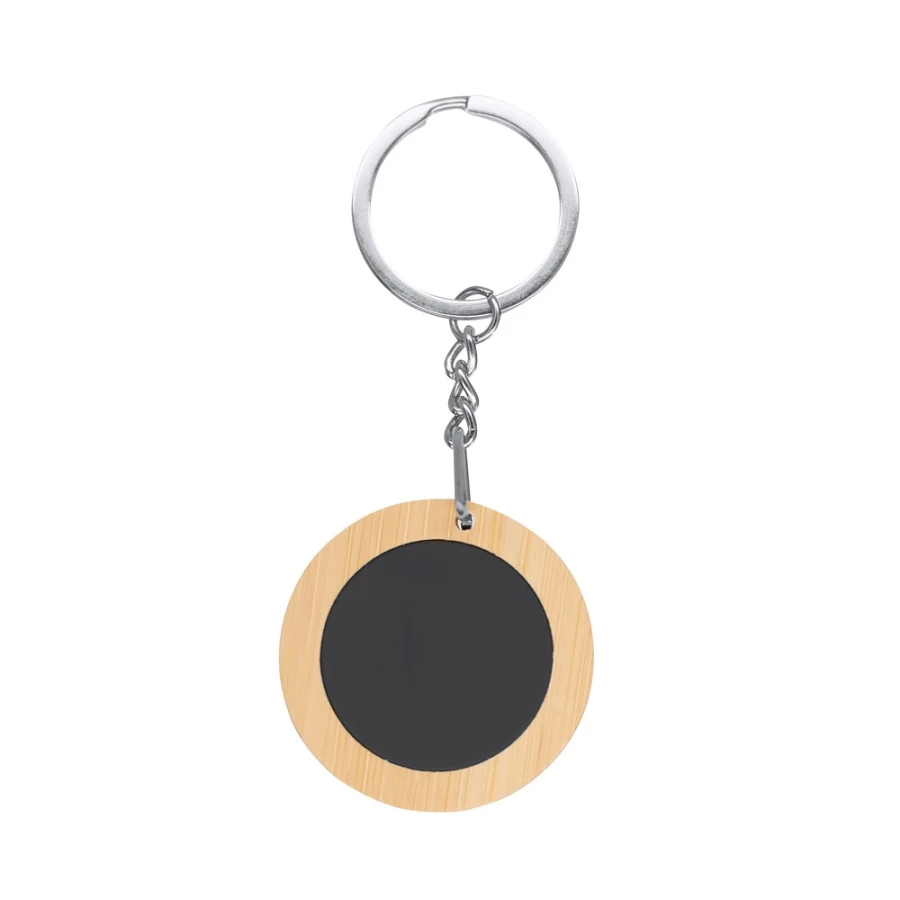 Brelok do kluczy z dedykowanym miejscem pod znakowanie (A-okrągły, B-prostokątny), grawer ukazuje lustrzaną powierzchnię, produkt wykonany z metalu i bambusa