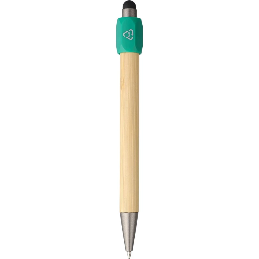 Bambusowy długopis z funkcją spinnera z ABS z recyklingu, czarna końcówka dotykowa na przycisku, wyposażony w mechanizm przyciskowy, wkład o grubości 1,0 mm oraz niebieski tusz o szacunkowej długości pisania 800 metrów, ikona ABS z recyklingu na produkcie