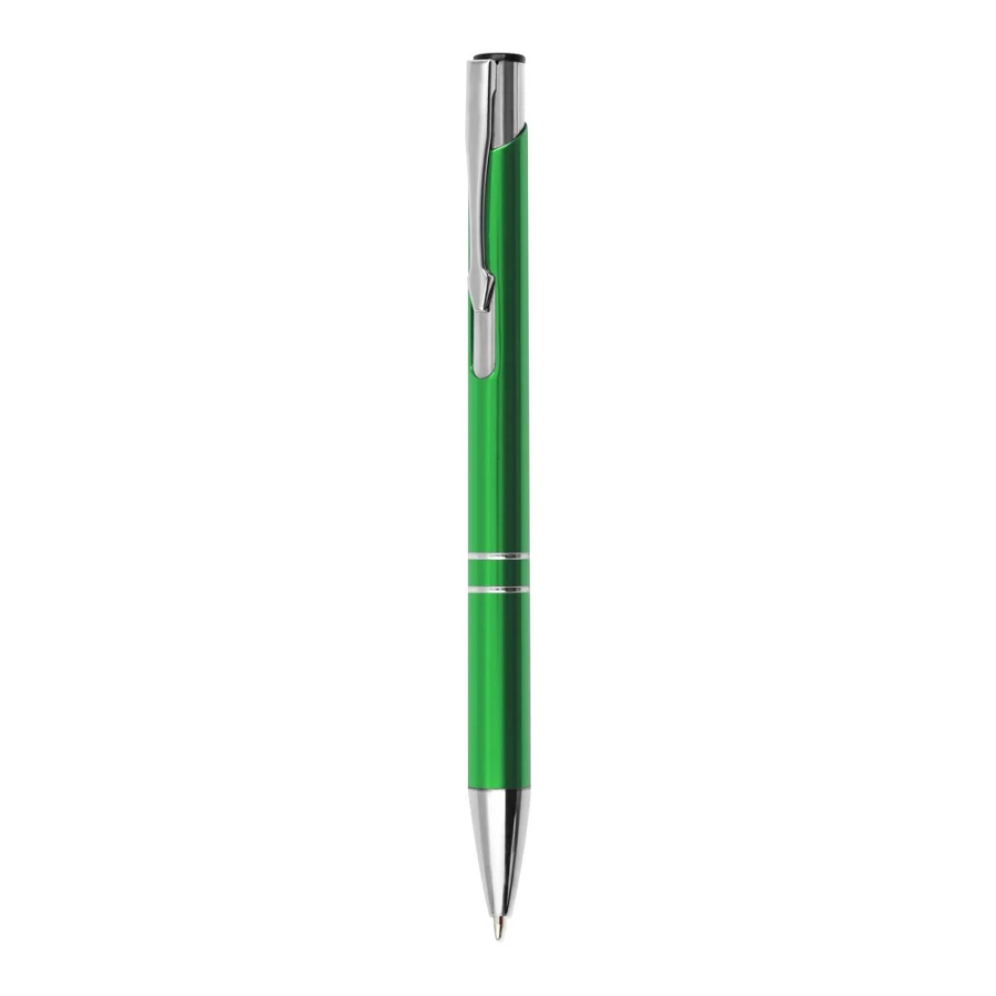 Długopis z kolorowym trzonem o błyszczącym wykończeniu, posiada elementy w srebrnym kolorze, wkład w niebieskim kolorze, produkt wykonany z aluminium