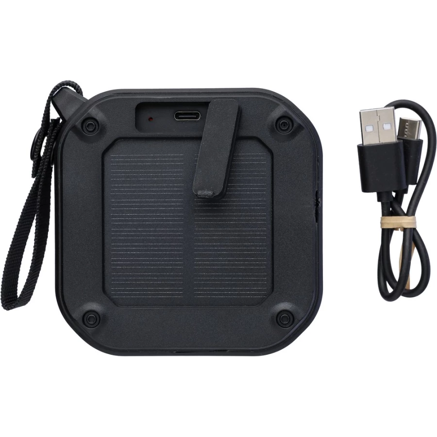 Głośnik bezprzewodowy, IPX6 co oznacza ochronę przed strumieniem wody przez 3 minuty, opaska na nadgarstek i karabińczyk umożliwiający przypinanie, moc wyjściowa 3 W, wejście DC 5 V, wbudowany akumulator 400 mAh, działa w odległości 15-20 metrów od źródła sygnału, stosunek sygnału do szumu 75 dB, częstotliwość 100 Hz-20 K Hz, kabel ładujący o długości 30 cm typu C w zestawie, wbudowana latarka LED (30 lumenów), panel słoneczny wydłużający czas użytkowania, 4 godziny czasu gry, BT 5.3, zapakowany ...